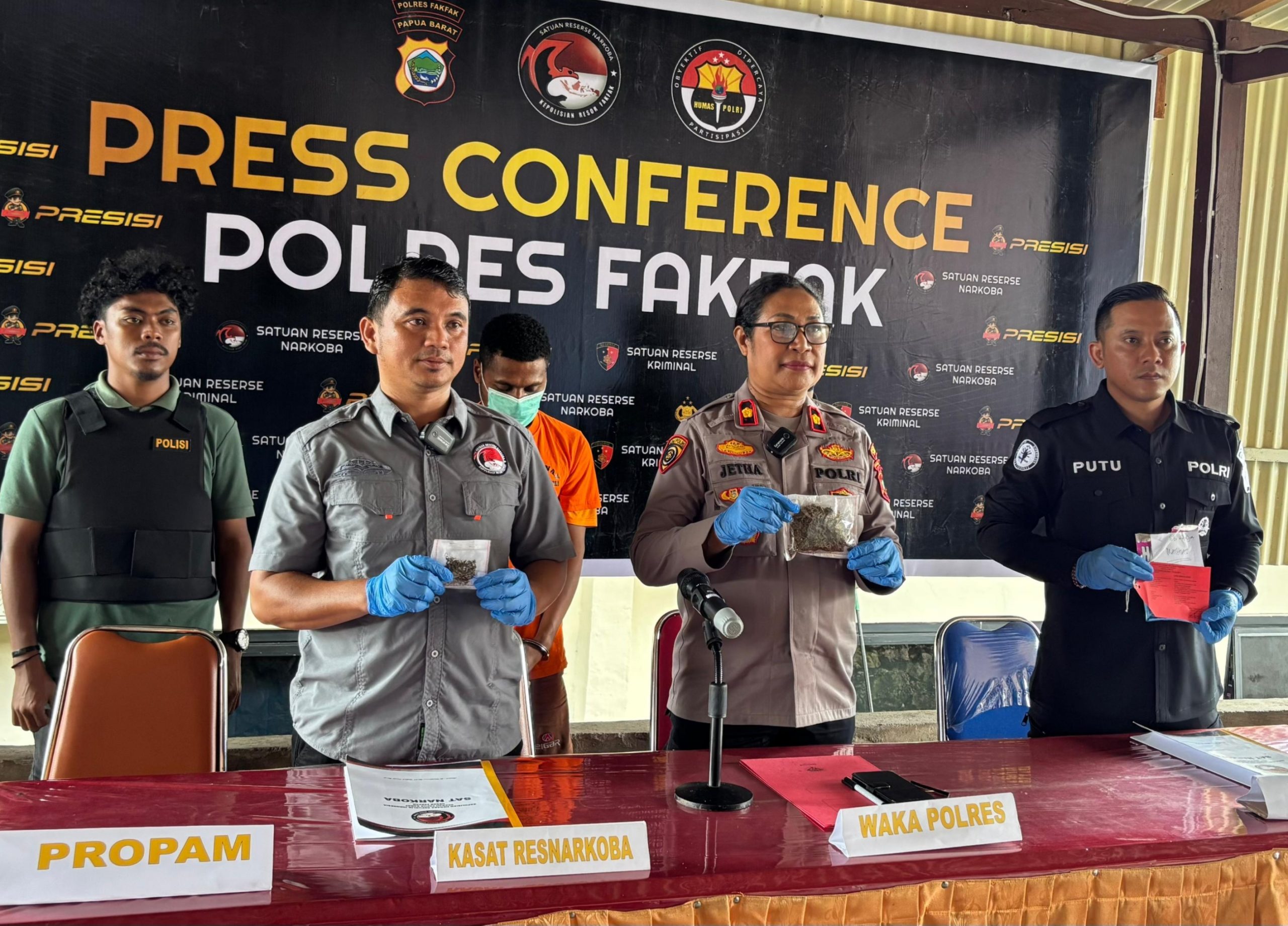 FAKFAK, PapuaStar.com– Jajaran Polres Fakfak kembali menegaskan komitmennya dalam memberantas penyalahgunaan narkotika di wilayah Papua Barat. Melalui sebuah Press Conference yang digelar di depan ruang Sat Resnarkoba Polres Fakfak, Kamis (11/09), aparat resmi merilis penanganan kasus penyalahgunaan narkotika golongan I jenis ganja dengan barang bukti sebanyak 32,4 gram (Tiga Puluh Dua Koma Empat Gram) ganja kering siap edar.