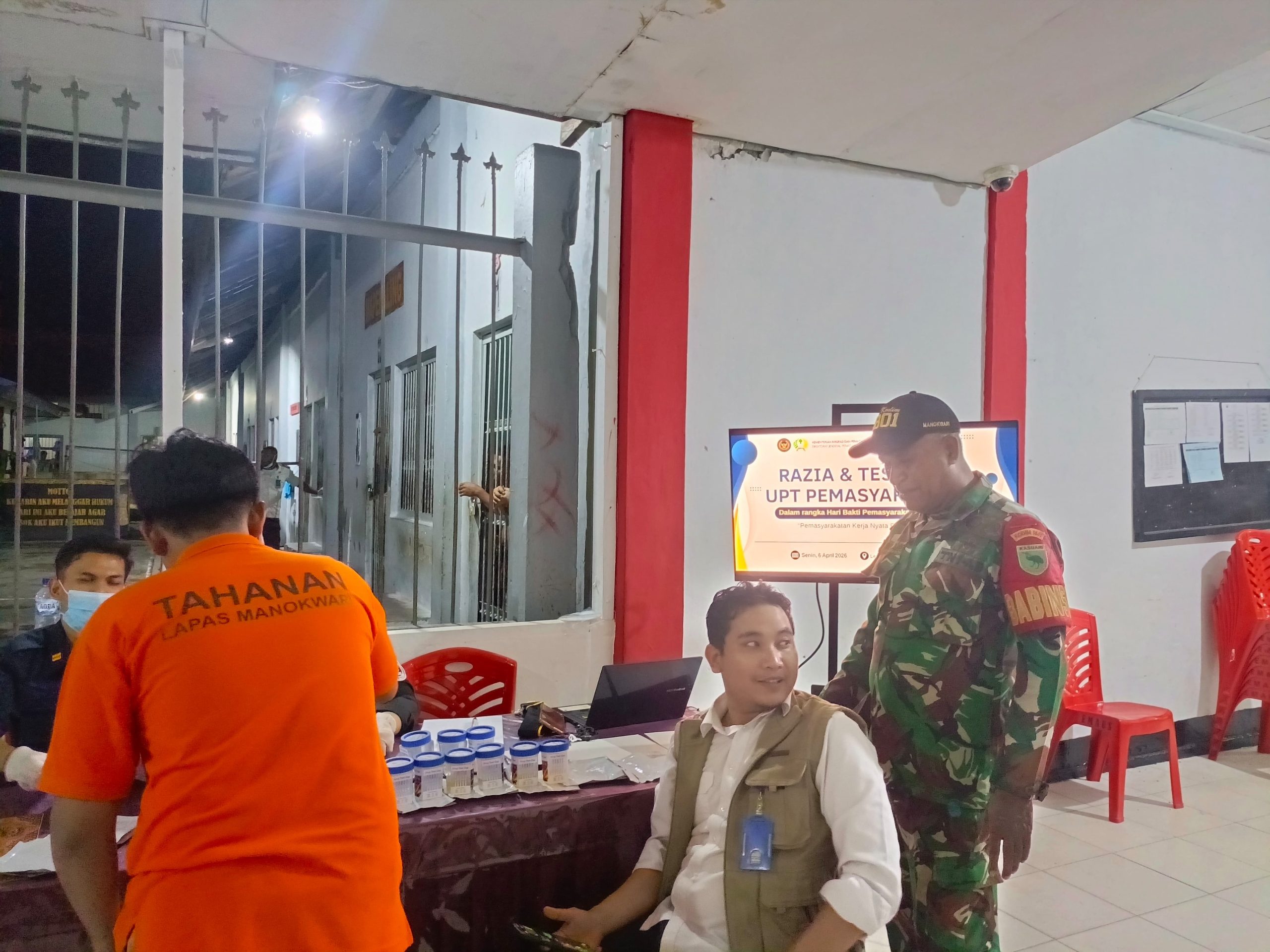MANOKWARI PapuaStar.com-Babinsa Pelda Boas Bolang bersama petugas Lapas,kepolisian,BNN melaksanakan tes Urin dan Razia dalam rangka memperingati Hari Bhakti Pemasyarakatan (HBP) ke-62, Lembaga Pemasyarakatan (Lapas) Kelas IIB Manokwari Papua Barat melaksanakan kegiatan razia kamar hunian serta tes urine bagi seluruh pegawai dan Warga Binaan Pemasyarakatan (WBP),Senin (06/04/2026).